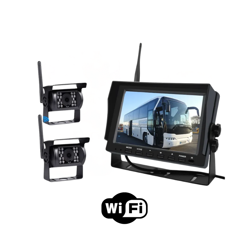 KIT 2 Camere de Supraveghere Auto 5mp Wireless. metalice IR cu Monitor 7 inch. pentru tiruri. autocare. camioane 12V-24V