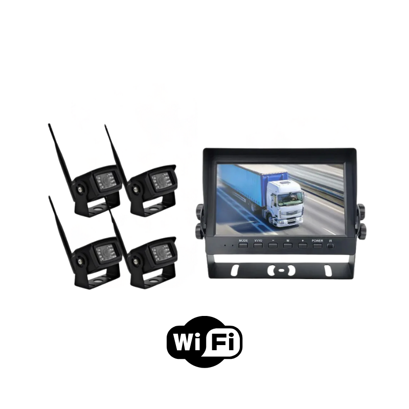 KIT 4 Camere de Supraveghere Auto 5mp Wireless. metalice IR cu Monitor 7 inch. pentru tiruri. autocare. camioane 12V-24V