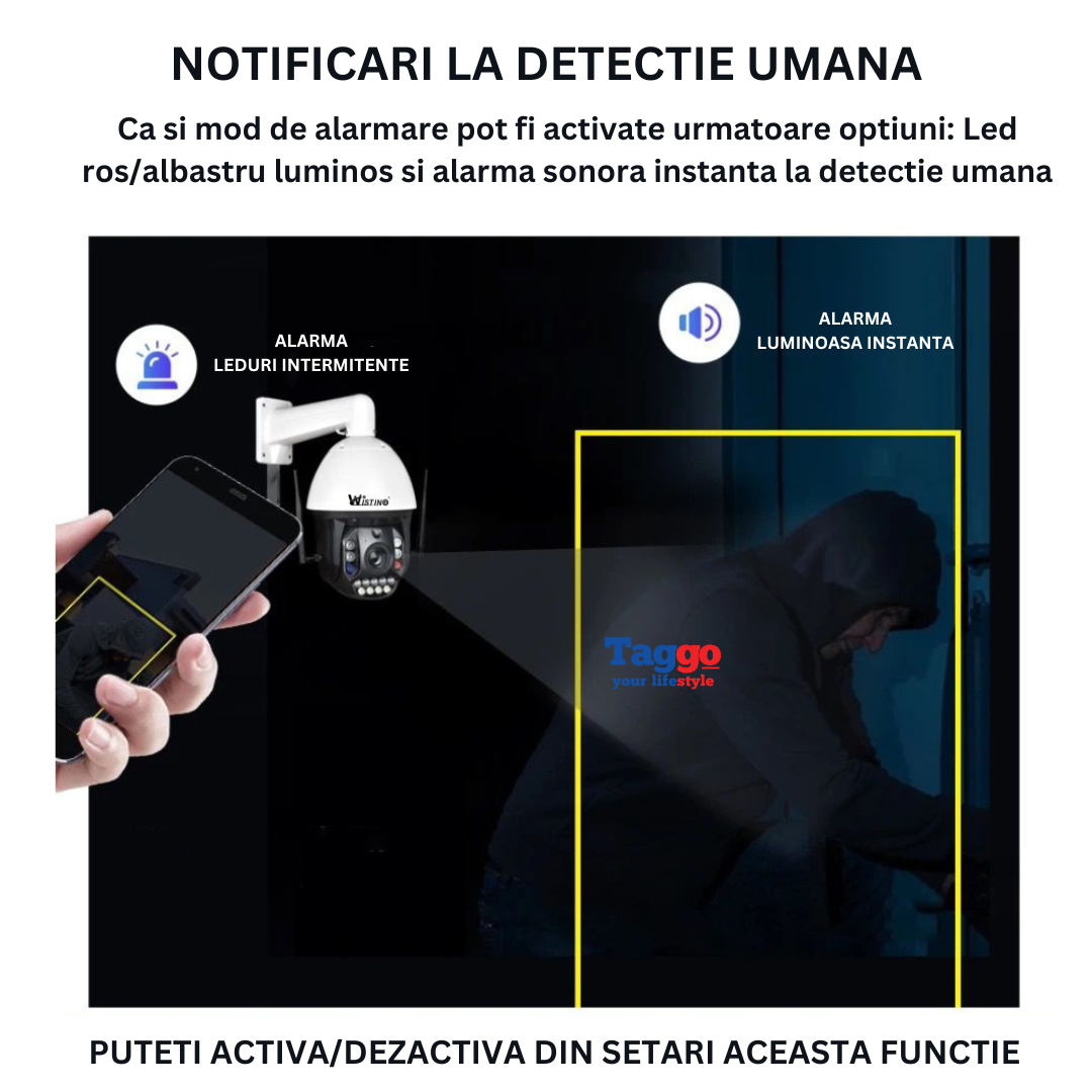 Alarma Luminoasă și Sonoră: În cazul unui incident. camera emite alarme vizuale și sonore pentru a alerta imediat.