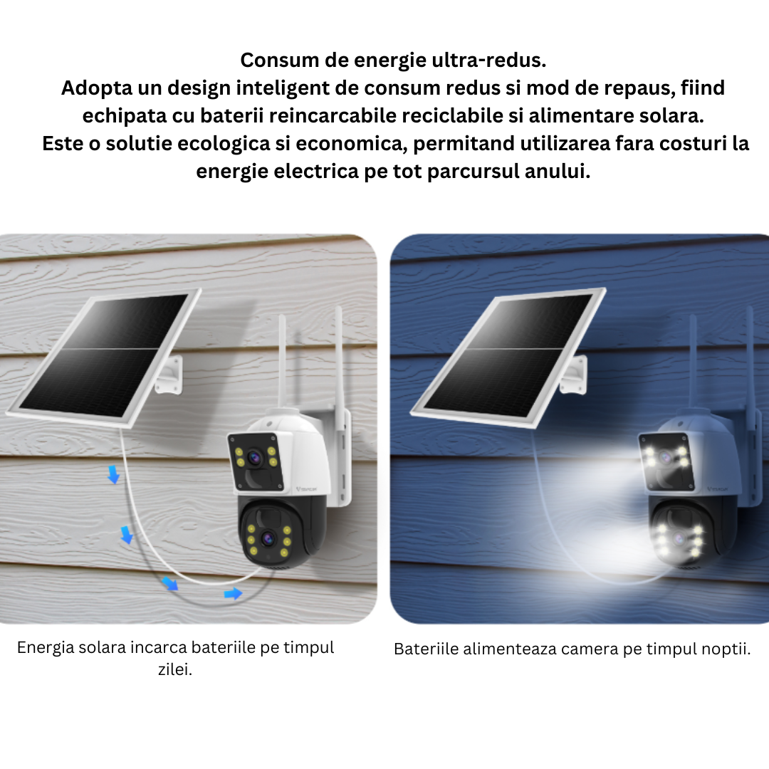Camera de supraveghere cu incarcare solara este o solutie avansata de supraveghere. echipata cu lentila dubla. detectie inteligenta a miscarii umane si conexiune 4G stabila. functionand fara WiFi sau cabluri. Cu o baterie puternica de 10.000mAh si alimentare solara. ofera autonomie extinsa si eficienta energetica. Beneficiaza de zoom automat. inregistrare duala si iluminare color zi/noapte. asigurand imagini clare in orice conditii.